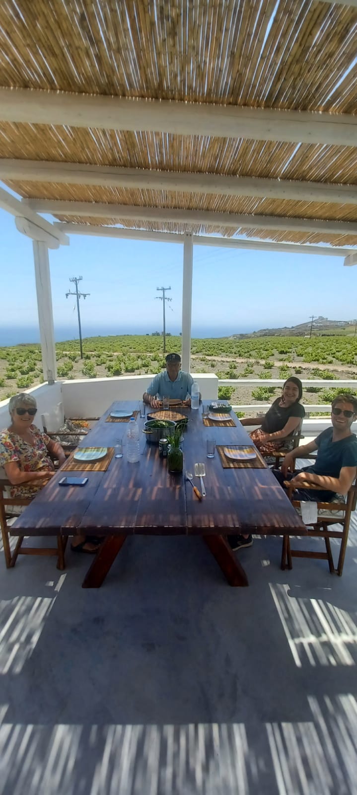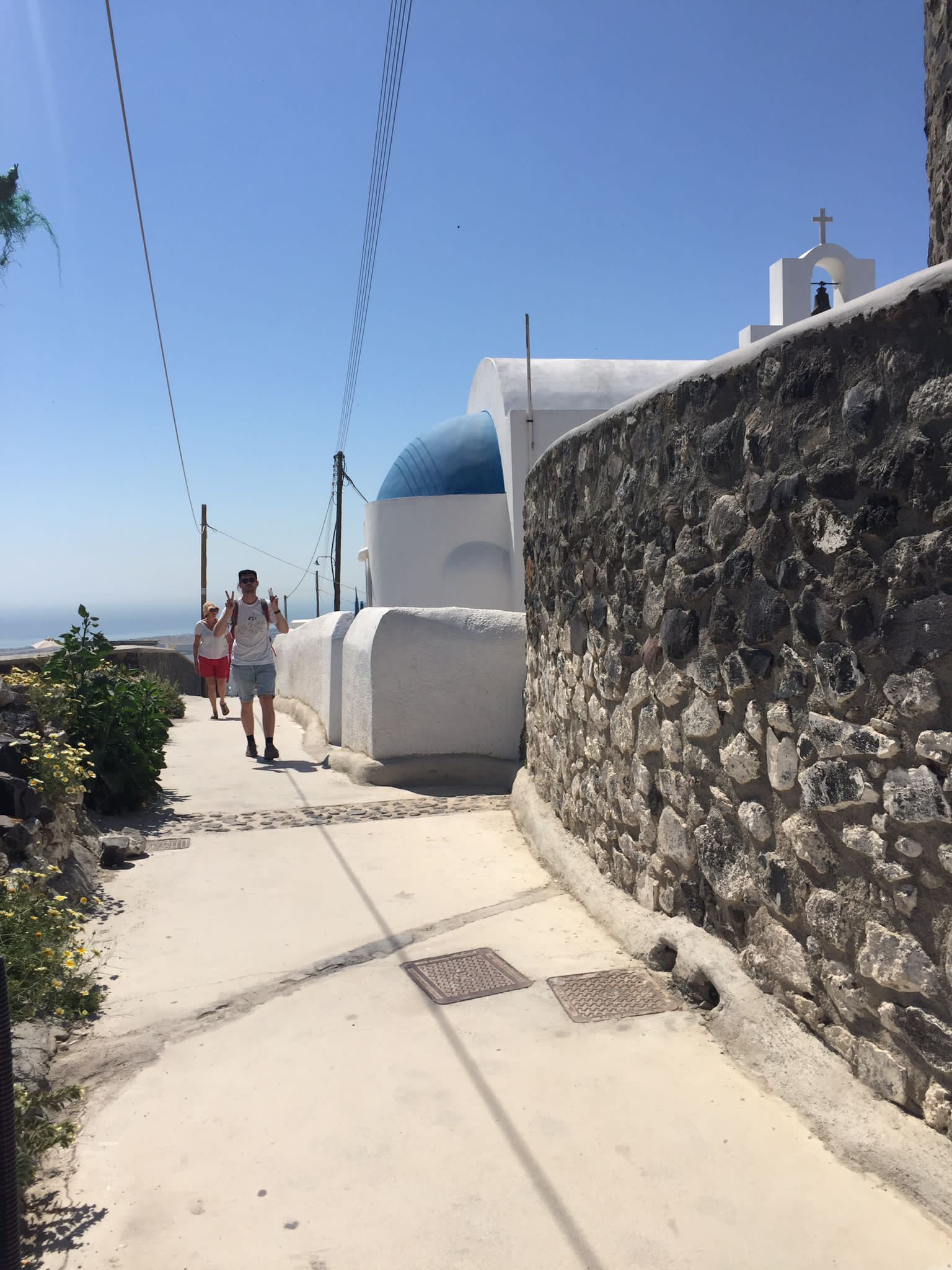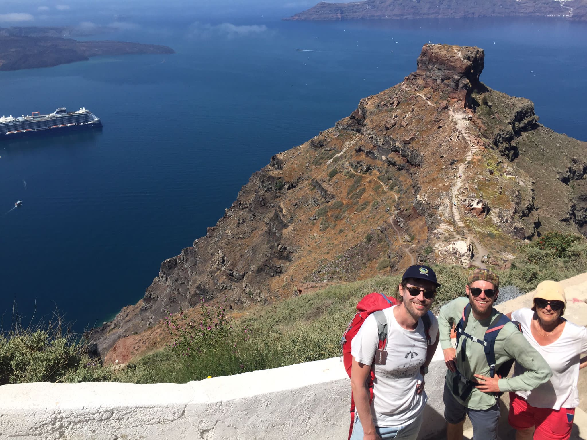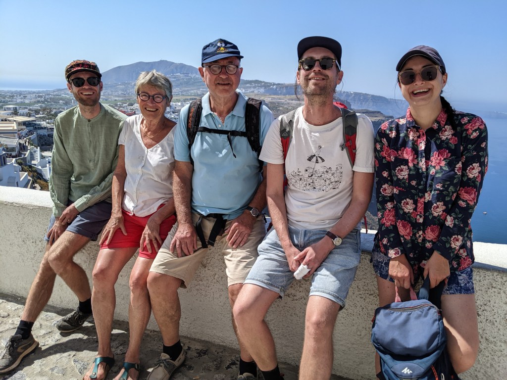 On arrive et paf qui s’est y qu’on croise ? Un Matthieu qui nous a rejoint pour une semaine de vacances et une Dina et un Romain qui sont aussi là en vacances. La soirée s’annonce sous de bons hospices. On fait une petite photo avec vue sur Fira, la capitale, by night.On est allés au resto, bien mangé bien bu, on est ben contents !La loc de la semaine, ça se passe de commentaires si ce n’est que les champs à l’arrière sont des champs de vigne, cultivée depuis plus de 3000 ans sur l’île.Oh non ! On avait dit pas de piscine ! On va être obligés d’en profiter maintenant !Fira, by day cette fois-ci, on peut voir la falaise abrupte qui entoure la caldeira. C’est le point de départ de notre randonnée pour rejoindre Oia au nord de l’île.Pause photo au début de la rando. On est encore frais.Néa Kaméni, le volcan en activité au centre de.la caldeira.Une jolie ruelle à l’arrière d’un monastère.L’apogée de notre société nombriliste. Les photos en robe longue avec du faux vent. Un incontournable de Santorin.En version plus couverte avec le monsieur qui crée le faux vent.La randonnée est superbe, on longe la caldeira sans pouvoir la quitter des yeux.Ça y est on est arrivés à Oia !Dégustation de vin après la randonnée et une visite d’Oia. Observez bien la mine réjouie. Au final ya du bon et du moins bon.En route vers Néa Kaméni le volcan au centre de la caldeira !Arrivée sur Néa Kaméni.Sommet atteint ! Toute l’île nous entoure la vue est superbe !Hé Thomas ! On va visiter le musée de la tomate ? Plus sérieusement, vraiment intéressant ce musée puisqu’on peut y voir la vie des habitants avant l’arrivée du tourisme. Pas facile facile… C’est le moins qu’on puisse direAllô ? Ouai t’es où je te trouve pas. Je suis au musée de la tomate je regarde une machine en bois. Ah bah moi aussi, tu sais où est papa ? Attends je l’appelle savoir où il est… Visite d’Akrotiri. On se tartine de crème pour éviter les brûlures en insistant bien sur le molet (une zone souvent oubliée). Monique vérifie l’homogénéité du tartinage et la fermeté du molet qualité indispensable du randonneur aguerri.La très belle vue du phare d’Akrotiri.Salut mes petites beautés ! Mettez un petit like ou un petit pouce en l’air si vous kiffez mes nouvelles lunettes mes petits fanzouz !Au port à Vlichada, au sud de l’île. Sans doute une image de Thalassa, déesse grecque de la mer, pour la protection du bateau.Santorini c’est fini ! En route pour la Grèce continentale.