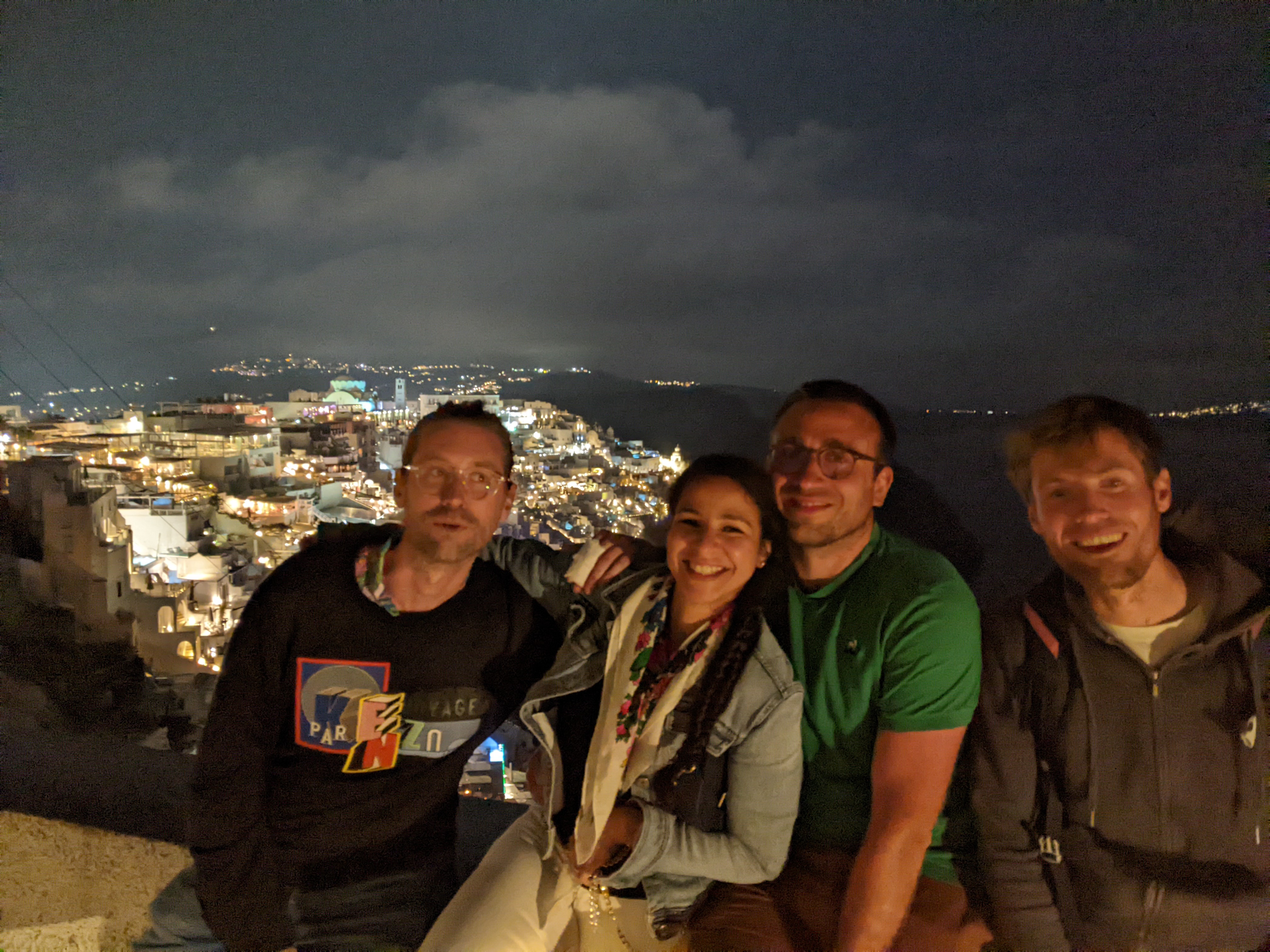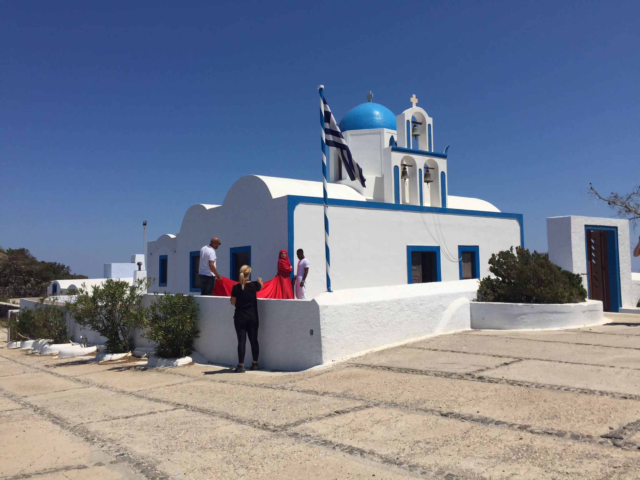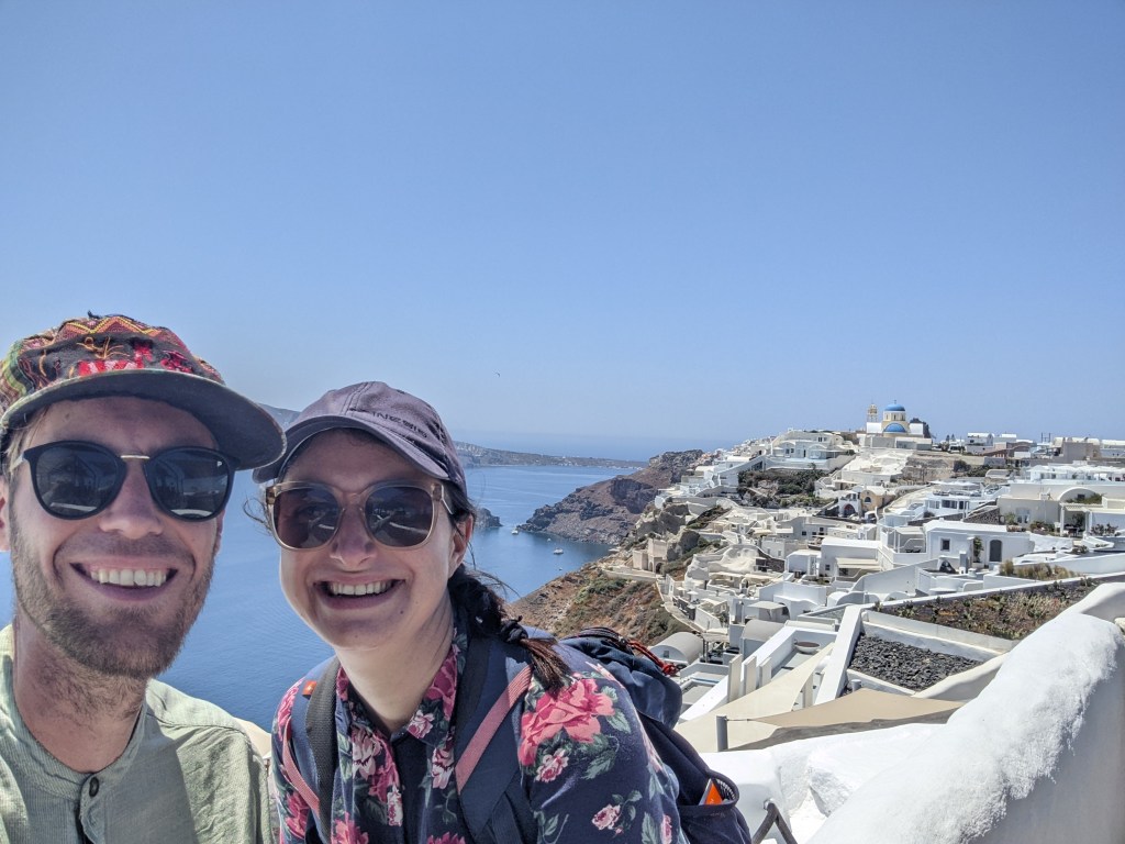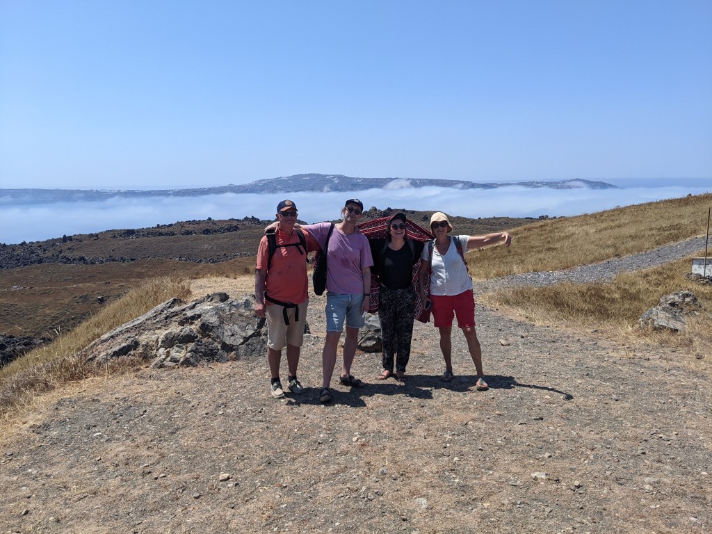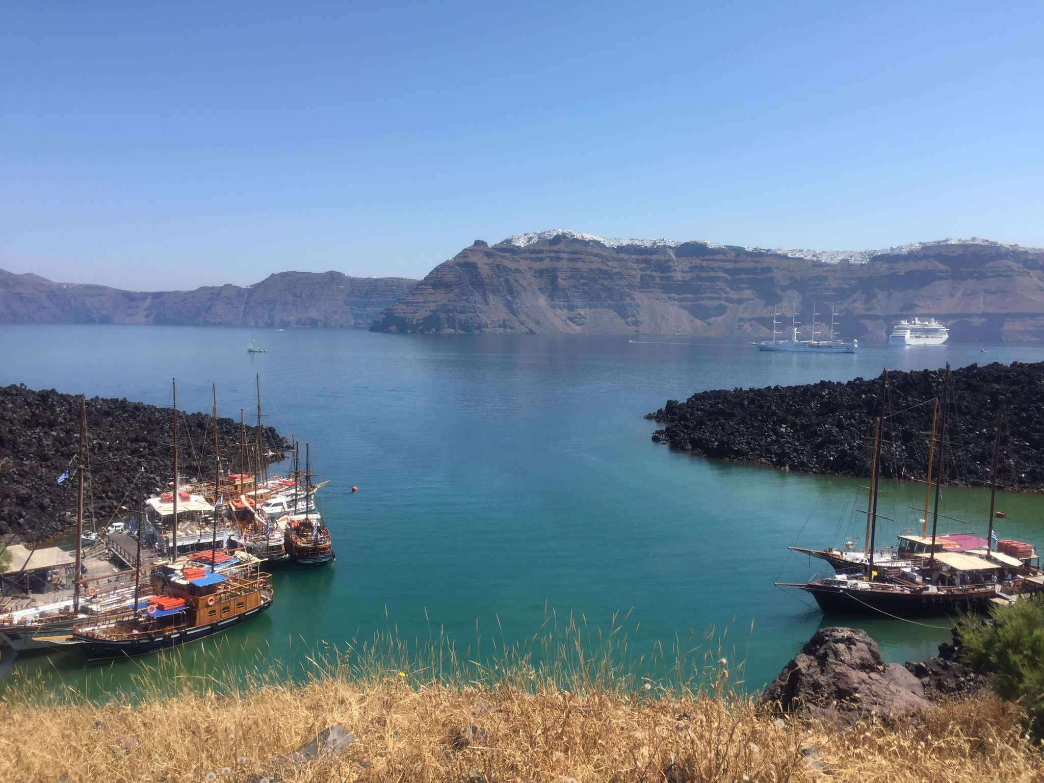 On arrive et paf qui s’est y qu’on croise ? Un Matthieu qui nous a rejoint pour une semaine de vacances et une Dina et un Romain qui sont aussi là en vacances. La soirée s’annonce sous de bons hospices. On fait une petite photo avec vue sur Fira, la capitale, by night.On est allés au resto, bien mangé bien bu, on est ben contents !La loc de la semaine, ça se passe de commentaires si ce n’est que les champs à l’arrière sont des champs de vigne, cultivée depuis plus de 3000 ans sur l’île.Oh non ! On avait dit pas de piscine ! On va être obligés d’en profiter maintenant !Fira, by day cette fois-ci, on peut voir la falaise abrupte qui entoure la caldeira. C’est le point de départ de notre randonnée pour rejoindre Oia au nord de l’île.Pause photo au début de la rando. On est encore frais.Néa Kaméni, le volcan en activité au centre de.la caldeira.Une jolie ruelle à l’arrière d’un monastère.L’apogée de notre société nombriliste. Les photos en robe longue avec du faux vent. Un incontournable de Santorin.En version plus couverte avec le monsieur qui crée le faux vent.La randonnée est superbe, on longe la caldeira sans pouvoir la quitter des yeux.Ça y est on est arrivés à Oia !Dégustation de vin après la randonnée et une visite d’Oia. Observez bien la mine réjouie. Au final ya du bon et du moins bon.En route vers Néa Kaméni le volcan au centre de la caldeira !Arrivée sur Néa Kaméni.Sommet atteint ! Toute l’île nous entoure la vue est superbe !Hé Thomas ! On va visiter le musée de la tomate ? Plus sérieusement, vraiment intéressant ce musée puisqu’on peut y voir la vie des habitants avant l’arrivée du tourisme. Pas facile facile… C’est le moins qu’on puisse direAllô ? Ouai t’es où je te trouve pas. Je suis au musée de la tomate je regarde une machine en bois. Ah bah moi aussi, tu sais où est papa ? Attends je l’appelle savoir où il est… Visite d’Akrotiri. On se tartine de crème pour éviter les brûlures en insistant bien sur le molet (une zone souvent oubliée). Monique vérifie l’homogénéité du tartinage et la fermeté du molet qualité indispensable du randonneur aguerri.La très belle vue du phare d’Akrotiri.Salut mes petites beautés ! Mettez un petit like ou un petit pouce en l’air si vous kiffez mes nouvelles lunettes mes petits fanzouz !Au port à Vlichada, au sud de l’île. Sans doute une image de Thalassa, déesse grecque de la mer, pour la protection du bateau.Santorini c’est fini ! En route pour la Grèce continentale.