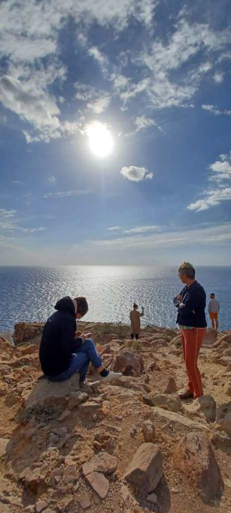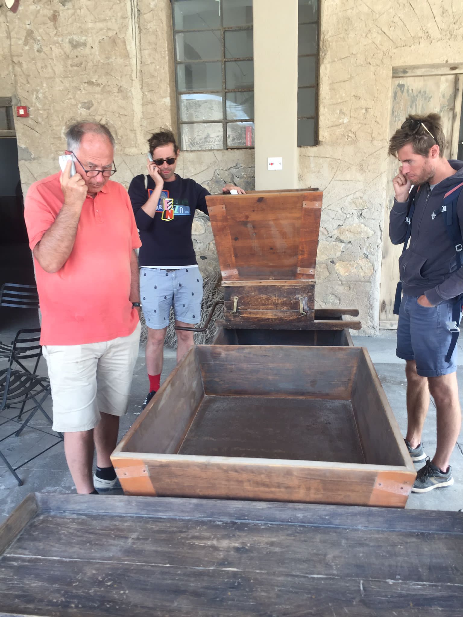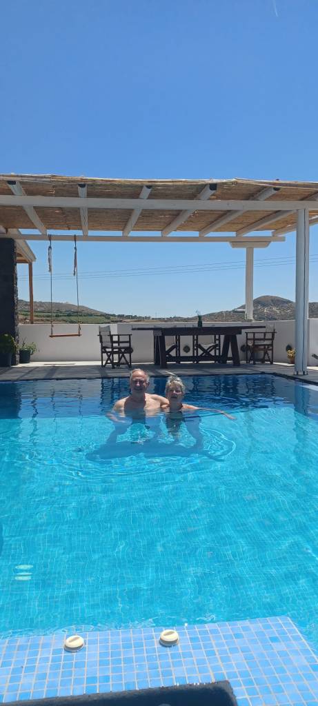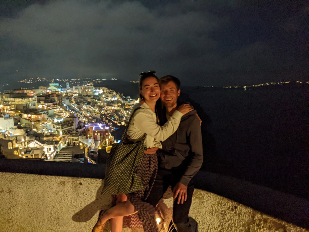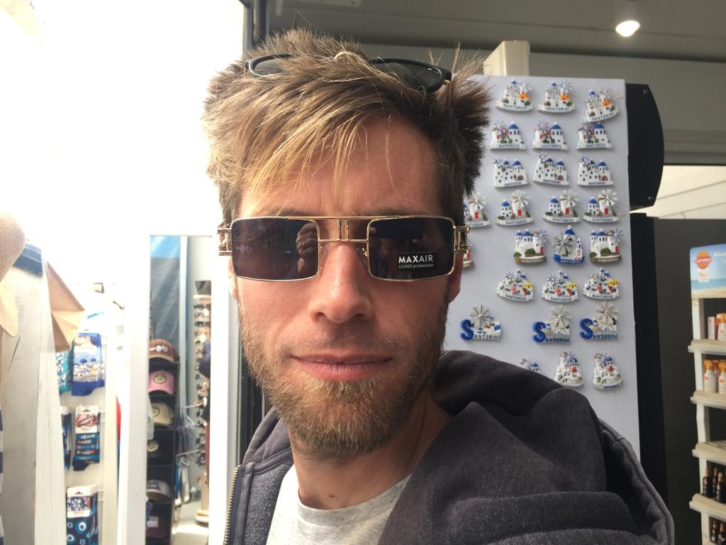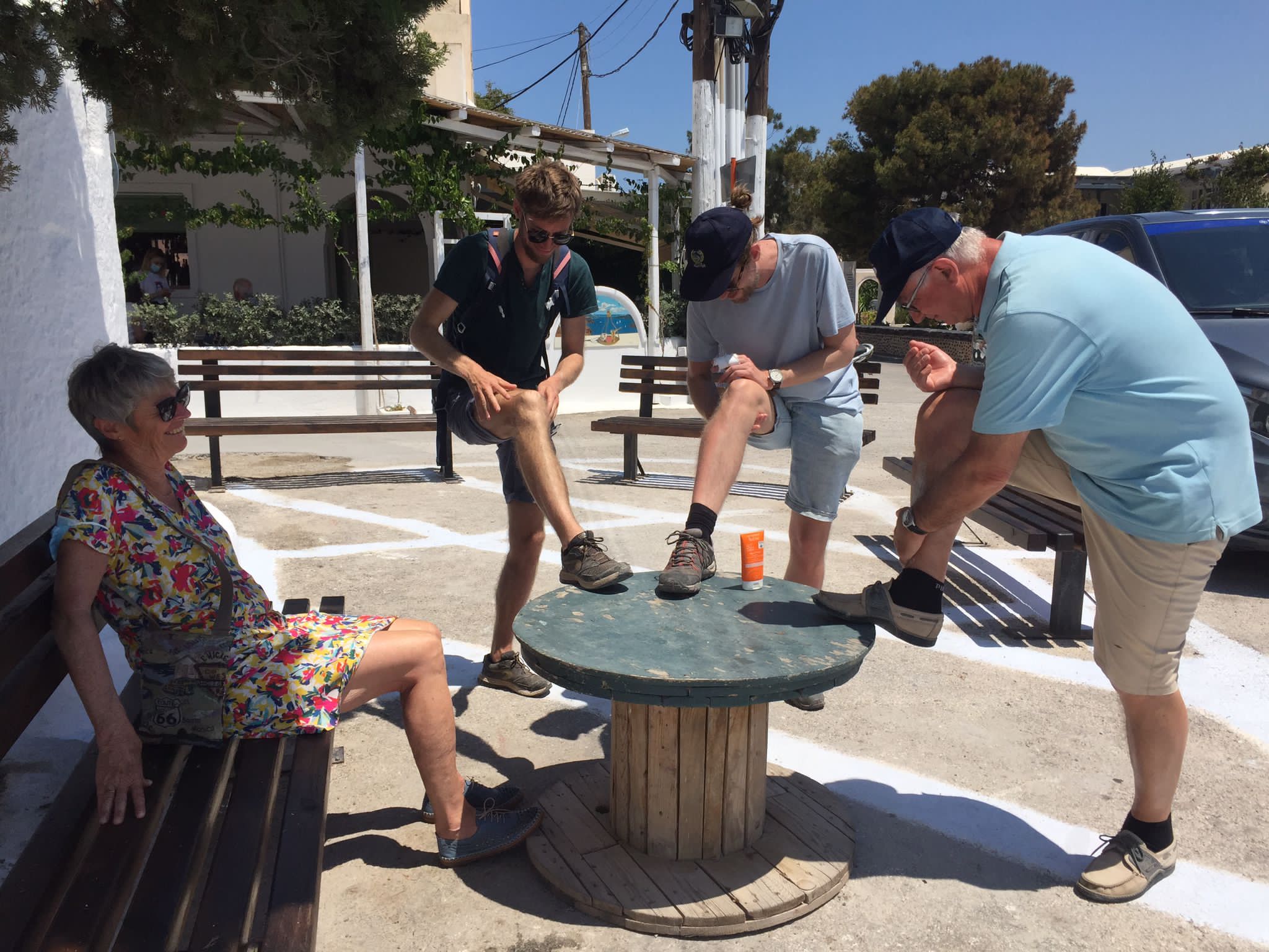 On arrive et paf qui s’est y qu’on croise ? Un Matthieu qui nous a rejoint pour une semaine de vacances et une Dina et un Romain qui sont aussi là en vacances. La soirée s’annonce sous de bons hospices. On fait une petite photo avec vue sur Fira, la capitale, by night.On est allés au resto, bien mangé bien bu, on est ben contents !La loc de la semaine, ça se passe de commentaires si ce n’est que les champs à l’arrière sont des champs de vigne, cultivée depuis plus de 3000 ans sur l’île.Oh non ! On avait dit pas de piscine ! On va être obligés d’en profiter maintenant !Fira, by day cette fois-ci, on peut voir la falaise abrupte qui entoure la caldeira. C’est le point de départ de notre randonnée pour rejoindre Oia au nord de l’île.Pause photo au début de la rando. On est encore frais.Néa Kaméni, le volcan en activité au centre de.la caldeira.Une jolie ruelle à l’arrière d’un monastère.L’apogée de notre société nombriliste. Les photos en robe longue avec du faux vent. Un incontournable de Santorin.En version plus couverte avec le monsieur qui crée le faux vent.La randonnée est superbe, on longe la caldeira sans pouvoir la quitter des yeux.Ça y est on est arrivés à Oia !Dégustation de vin après la randonnée et une visite d’Oia. Observez bien la mine réjouie. Au final ya du bon et du moins bon.En route vers Néa Kaméni le volcan au centre de la caldeira !Arrivée sur Néa Kaméni.Sommet atteint ! Toute l’île nous entoure la vue est superbe !Hé Thomas ! On va visiter le musée de la tomate ? Plus sérieusement, vraiment intéressant ce musée puisqu’on peut y voir la vie des habitants avant l’arrivée du tourisme. Pas facile facile… C’est le moins qu’on puisse direAllô ? Ouai t’es où je te trouve pas. Je suis au musée de la tomate je regarde une machine en bois. Ah bah moi aussi, tu sais où est papa ? Attends je l’appelle savoir où il est… Visite d’Akrotiri. On se tartine de crème pour éviter les brûlures en insistant bien sur le molet (une zone souvent oubliée). Monique vérifie l’homogénéité du tartinage et la fermeté du molet qualité indispensable du randonneur aguerri.La très belle vue du phare d’Akrotiri.Salut mes petites beautés ! Mettez un petit like ou un petit pouce en l’air si vous kiffez mes nouvelles lunettes mes petits fanzouz !Au port à Vlichada, au sud de l’île. Sans doute une image de Thalassa, déesse grecque de la mer, pour la protection du bateau.Santorini c’est fini ! En route pour la Grèce continentale.