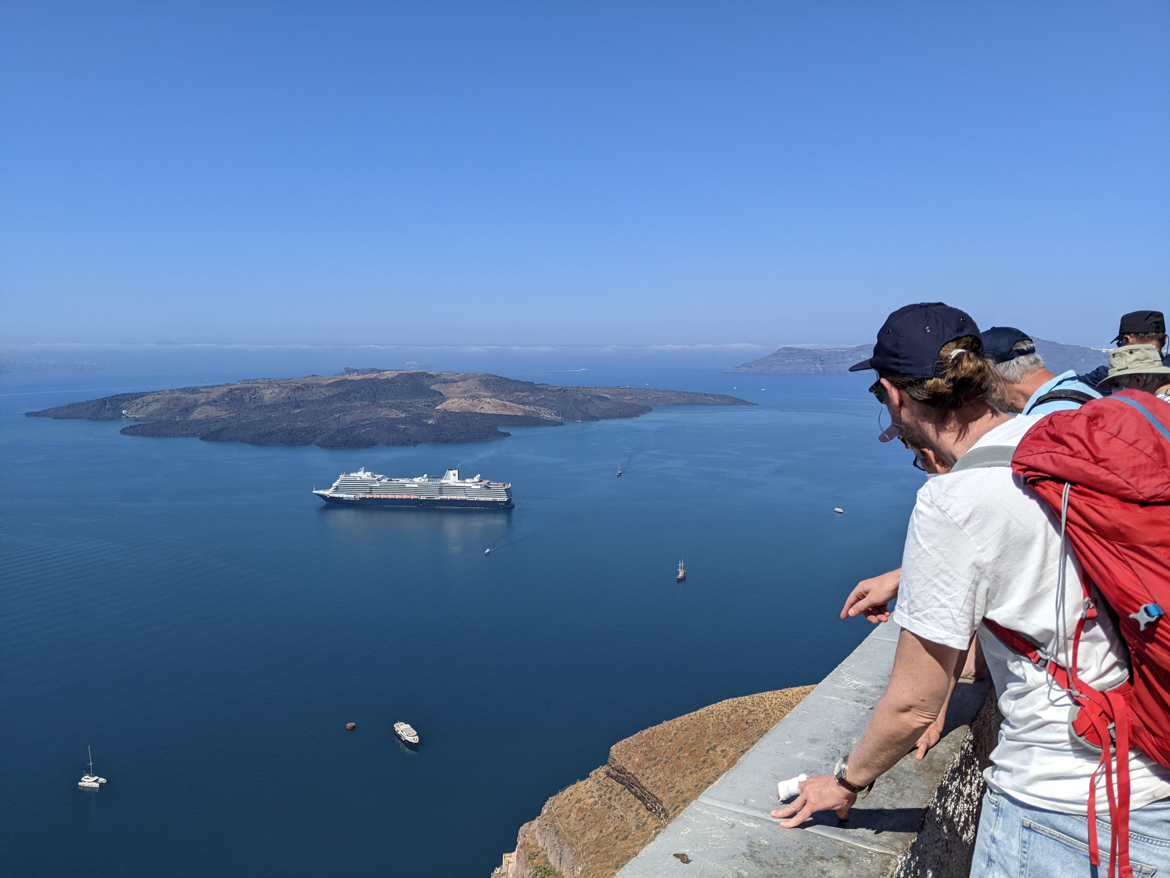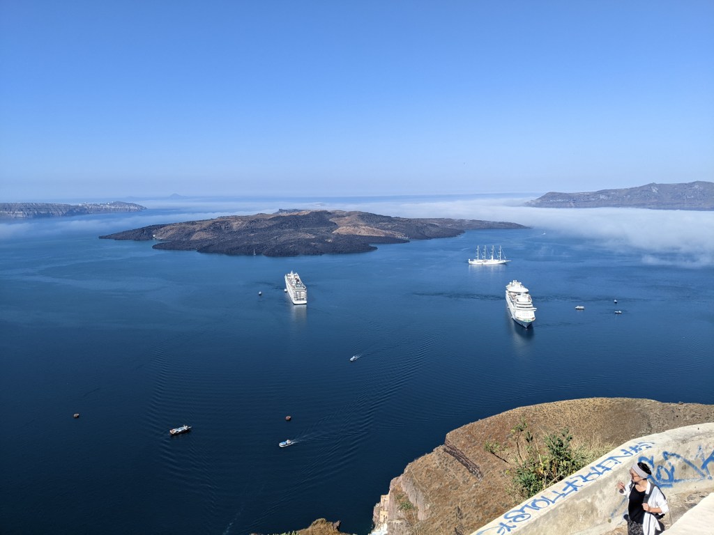 Après Sifnos nous voici arrivés à Santorin, Thira pour les grecs et Santoraynaaaayyy pour la multitude de touristes de tous pays qui se massent sur l’île. C’est superbe ! Un paysage unique que cette île en croissant de lune entourant une caldeira formée par l’effondrement d’un énorme volcan.