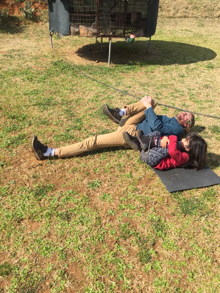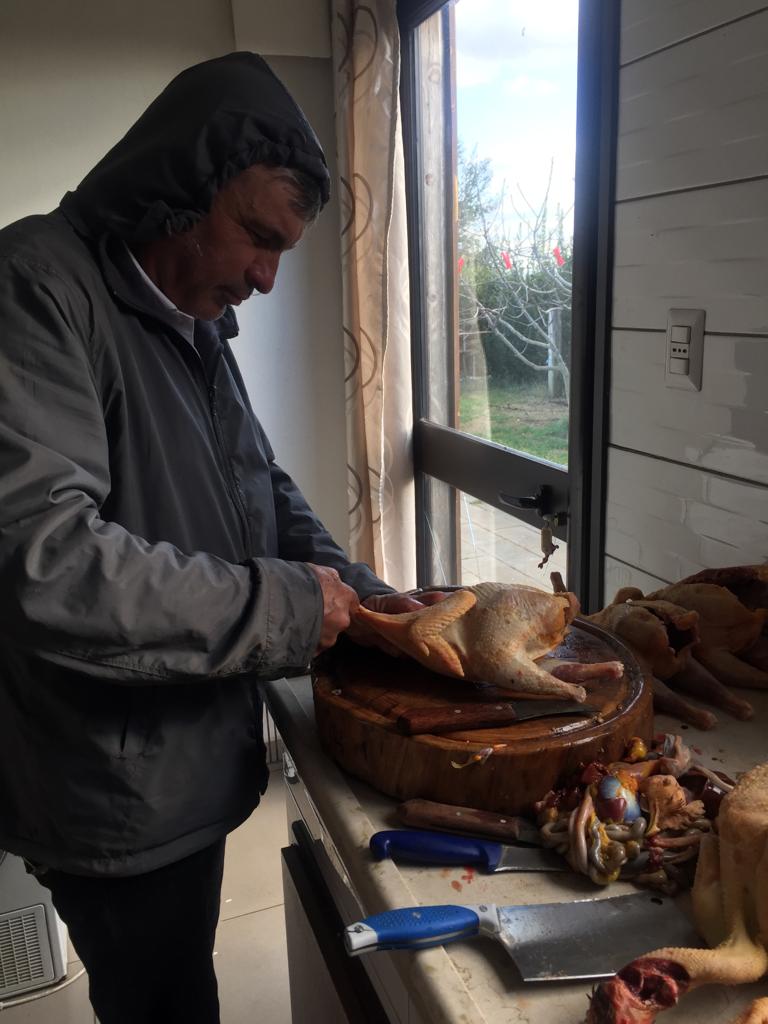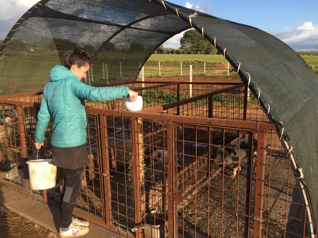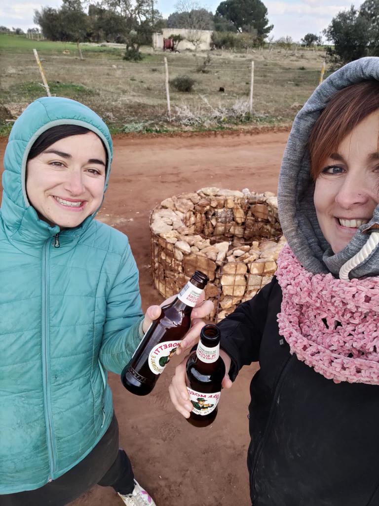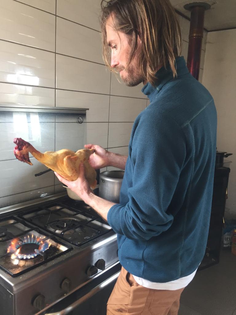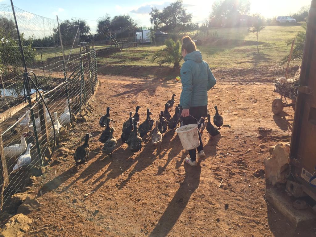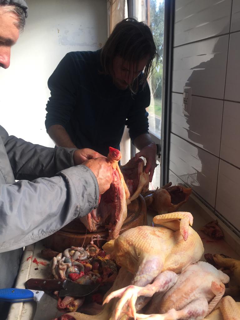 On arrive chez Claudio et Tania et bim ! Direct il faut s’occuper de vider 10 poules fraîchement tuées. Étape 1 : brûler les poils.Étape 2 : découper la poule. Claudio est très expérimenté.Étape 3 : vider les entrailles. Pas si facile que ça. Cela demande quelques connaissances en anatomie de la poule et Claudio en a beaucoup !Après le vidage de poule, petite pause et fin de la lecture du polar de ThomasMorning routine et evening routine, il faut donner à manger et boire aux animaux. Le petit cochon de droite n’en a plus pour très longtemps avant de finir en jambon, mais chuuut ! Ne pas trop y penser quand on lui donne à manger.Les canards ! Coin coin !Les oies, les méchantes oies pas sympas avec les canards.Plutôt uniquement morning routine, traire la vache. Ici c’est Lisa qui s’y colle ! Cela demande un doigté et un coup de main expert pour faire sortir le lait avec un bon débit. Avec le lait Tania fait du doce de Leite (une sorte de confiture de lait), mmmmmmm ! Fin de la morning routine, Thomas se prépare pour son summer body et montre quelques étirement du dos à Vittoria. Bon clairement elle est beaucoup plus souple que lui !Évidement on n’a pas pris tout le lait de la vache parce qu’elle a un petit veau. Trop mignonnnnn ! (80 kg à la naissance c’est gros !)Combat d’asperges sauvages. Celles-ci finiront en omelette.Un orgue lowrey, le rêve de Tania depuis qu’elle est petite. Ils sont allés le chercher loiiiin en voiture en Angleterre.Instant mignon ! La vache et son petit veau !Ouf c’est dur ! Lisa casse des pierres pour construire un cercle en pierre pour faire du feu.Après avoir ramassé les pierres dans le champ d’à côté (assez physique !) On rempli l’armature en métal.Et voilà le résultat ! Thomas vérifie l’alignement ou s’apprête à sauter par dessus on sait pas trop.Lisa trinque avec Gabrielle, bien contente, qui pourra utiliser ce coin feu quand elle se sera installée sur le terrain.Selfie de Lisa avec Tania.Le super cadeau de Lisa à sa filleule Leila : un arbre !Il faut bien l’arroser pour qu’il reprenne des forces et qu’il s’ancre bien dans la terre. Lisa a mis pas mal de compost aussi pour lui donner un coup de boost !Coucher de soleil sur la ferme.On grave une plaque avec nos prénoms pour identifier les arbres qu’on a plantés. Une plaque pour Leila et une plaque pour nous.Ça c’est nous qui fait des bisous devant notre arbre !