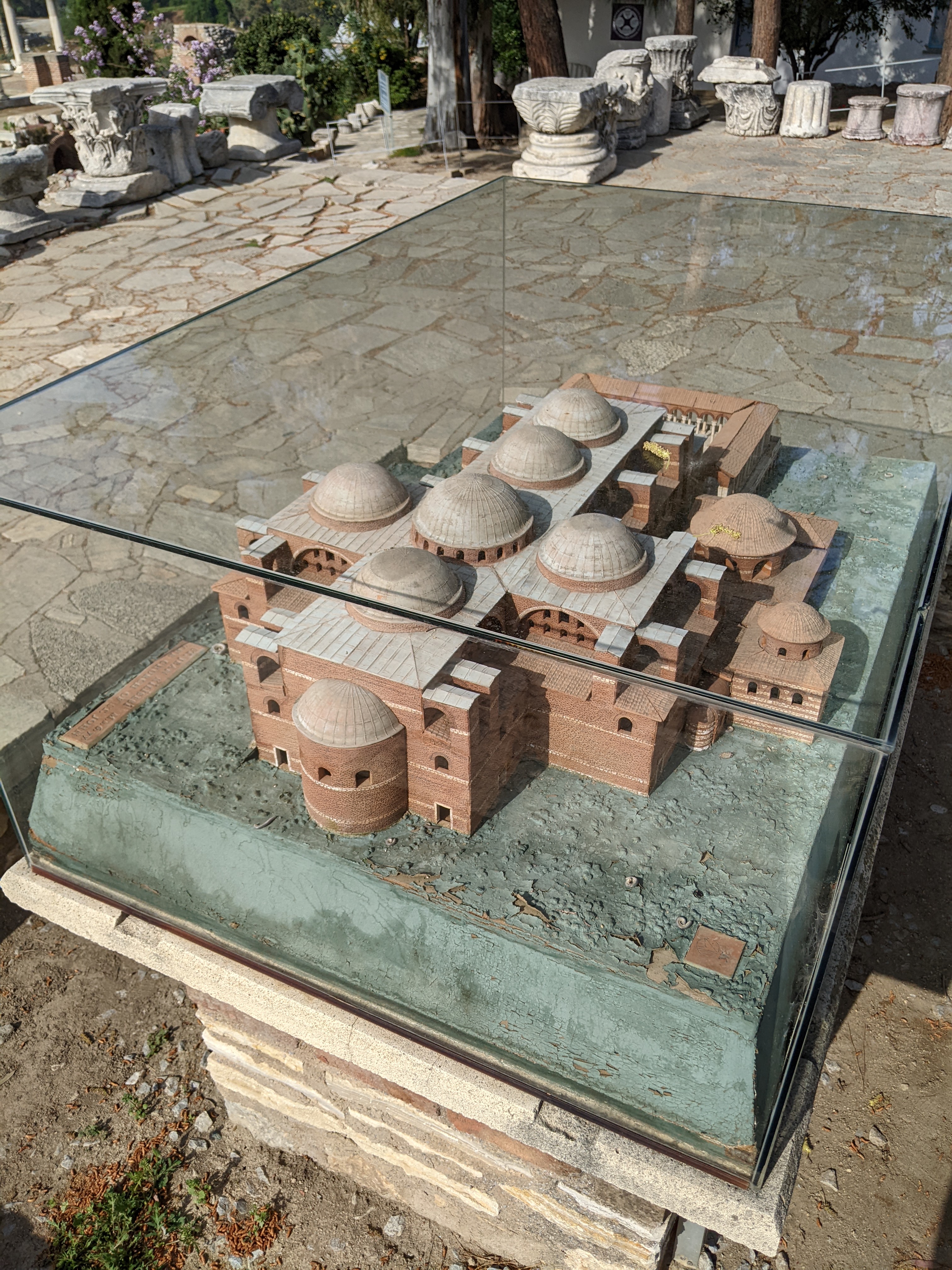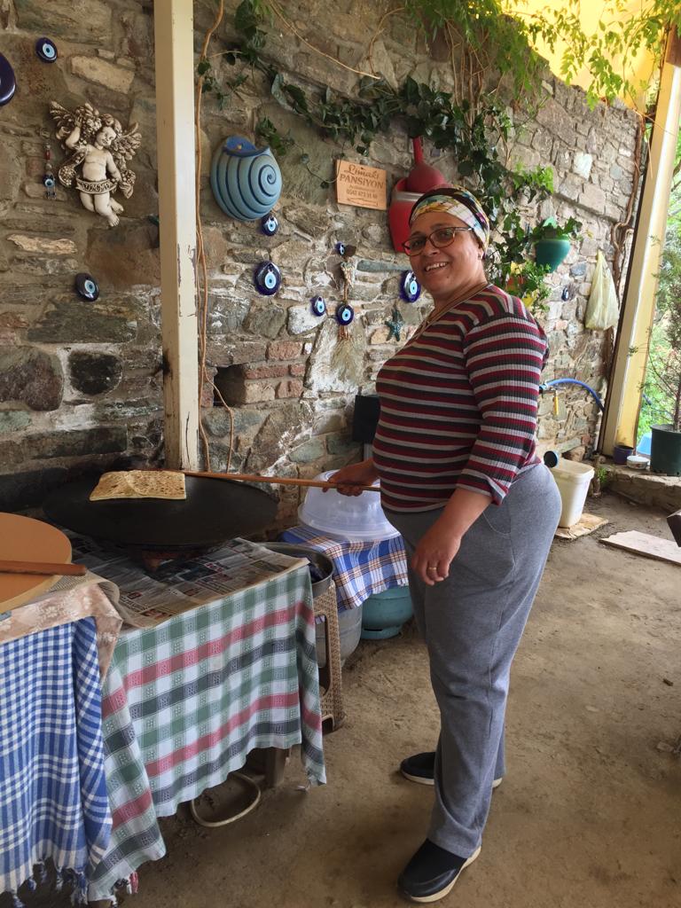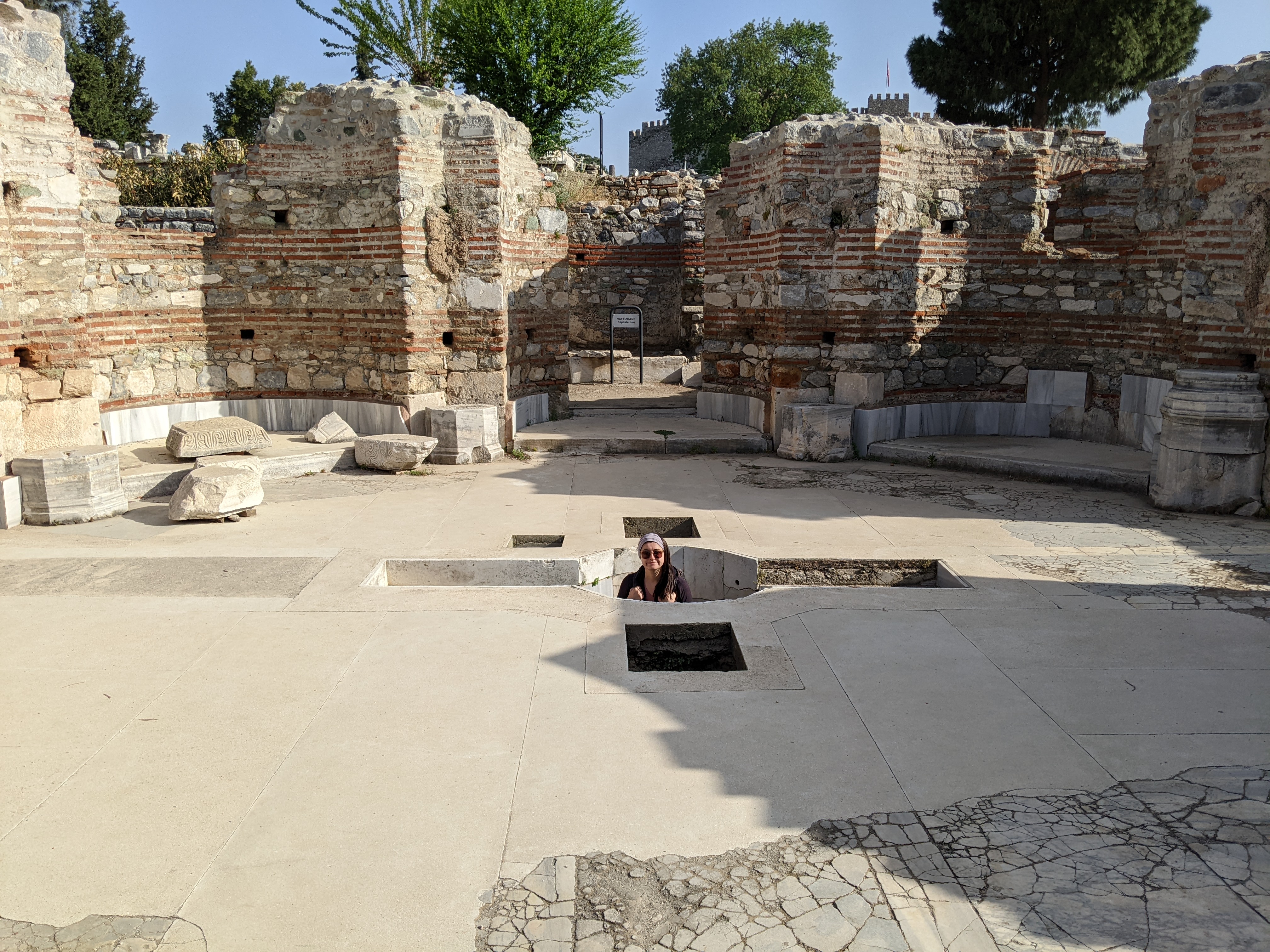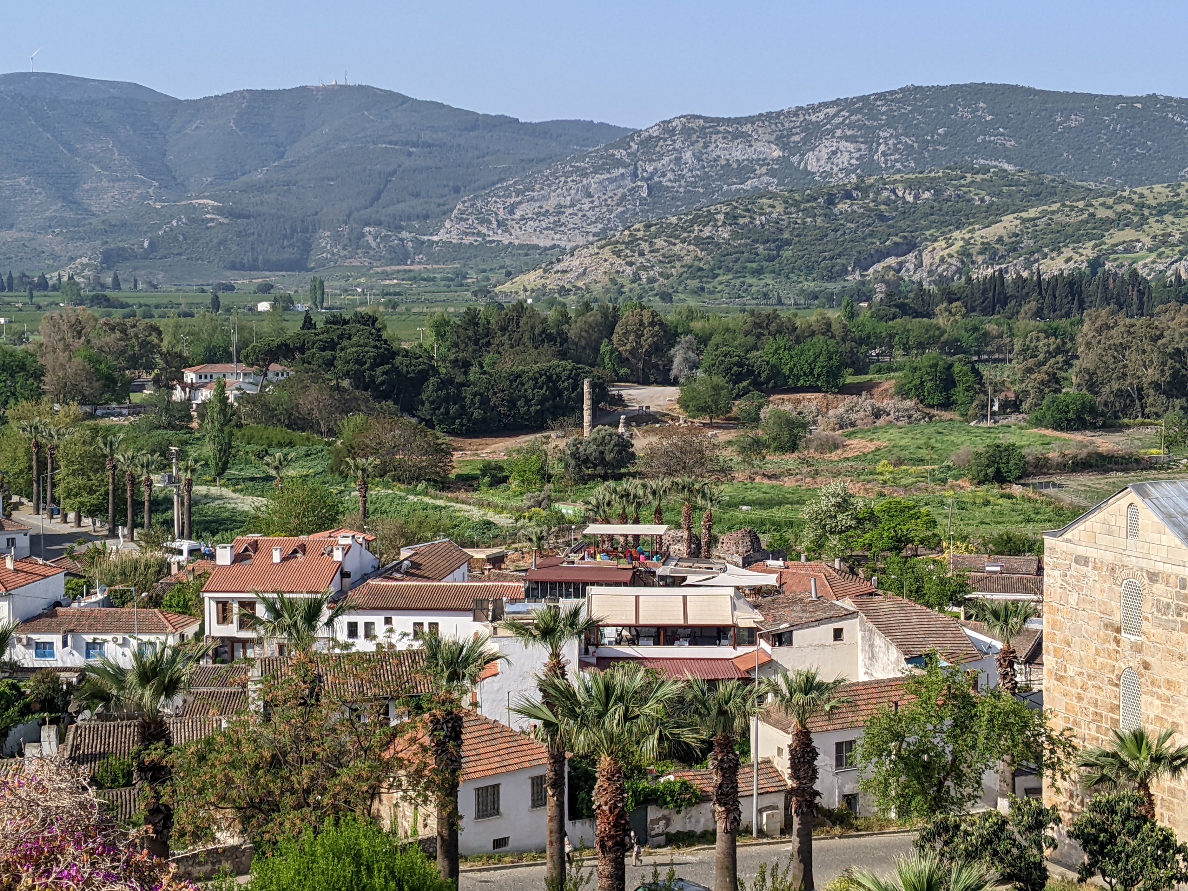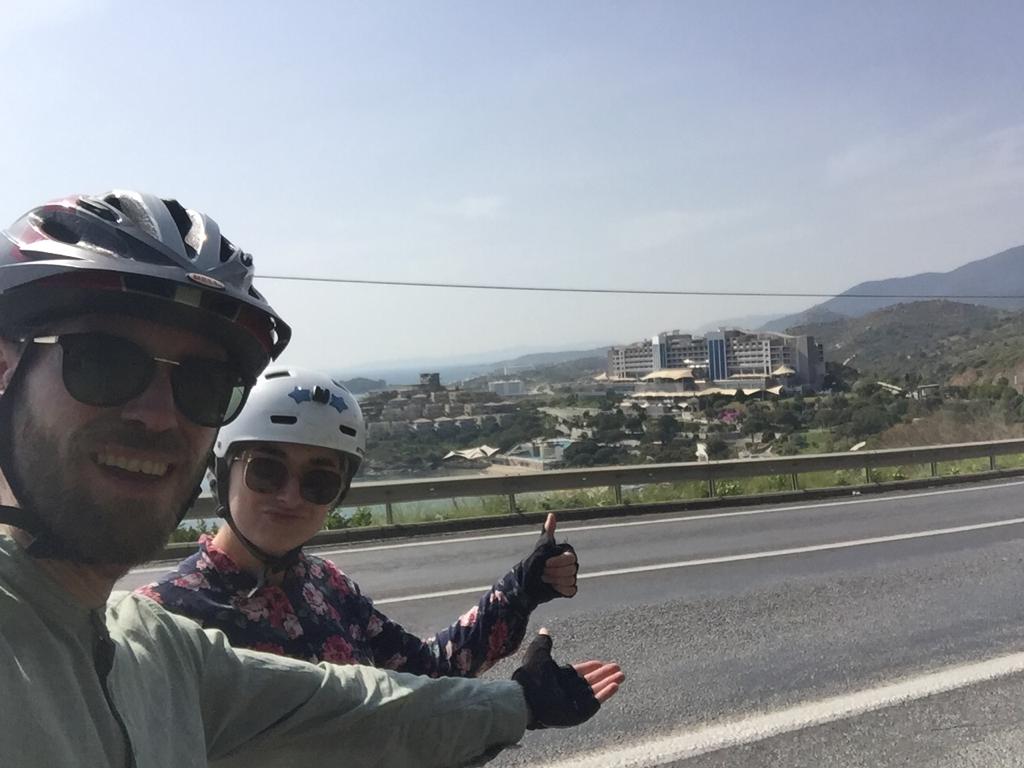 La region de Selçuk est très connue pour le site antique d’Éphèse mais on y trouve d’autres sites historiques. Derrière Lisa c’est la basilique Saint Jean construite à l’emplacement de la tombe de Saint Jean l’évangéliste. Amen !Les ruines permettent d’imaginer la taille impressionnante de la basilique mais pas l’architecture. Heureusement il y a une maquette !Coucou ça c’est nous devant l’entrée de la basilique !Coucou ça c’est Lisa dans le bassin du baptistère !Selçuk est une ville très riche d’Histoire et de civilisation qui se sont succédées. Depuis la basilique on peut voir la mosquée d’Isa Bey construite au XIV ème siècle. Et juste sur la gauche de la mosquée une colonne toute seule. Zoomons pour mieux voir…… Voilà, vous voyez au milieu de la photo ? Cette unique colonne est tout ce qui reste du temple d’Artemis une des sept merveilles du monde Antique. Le temple a un peu perdu de sa superbe.Après une petite demi-heure de vélo nous voici déambulant dans les rues d’Éphèse. Les backpackers n’avaient pas tort, le site est très bien conservé on s’y croirait !Le chef d’oeuvre de restauration de la citée, la façade de la bibliothèque. Avec une façade comme ça on a furieusement envie de lire des livres.C’est nous devant la bibliothèque ! Malheureusement on n’a pas trouvé les livres.Encore du beau boulot de restauration !Le théâtre le plus grand du monde antique. Tellement grand qu’il ne rentre pas entièrement dans la photo.Les mosaïques et les peintures des maisons romaines sont aussi bien conservées qu’à Pompeï.Avant de repartir pour 4 jours de vélo jusqu’à Çesme nous décidons de faire un détour à Şirince, un joli village à 10 km de Selçuk. 10 km de montée ! Alors une petite crêpe locale faite sur une billig arrondie n’est pas de trop en arrivant. Mmmmm elle est bonne et ça passe bien avec un petit thé !Back on the bike.Les beaux complexes hôteliers de la región de Kuşadası (prononcer couchadasseu)On est bien contents ! Ah mais attention le nez commence à rougir, vite mettons de la crème solaire.J’espère que j’en ai mis assez…Petite pause en haut de la côte on est bientôt à Çeşme la fin de notre escapade turque.On reviendra avec plein de souvenirs notamment gustatifs, la cuisine turque est AMAZING !!!!