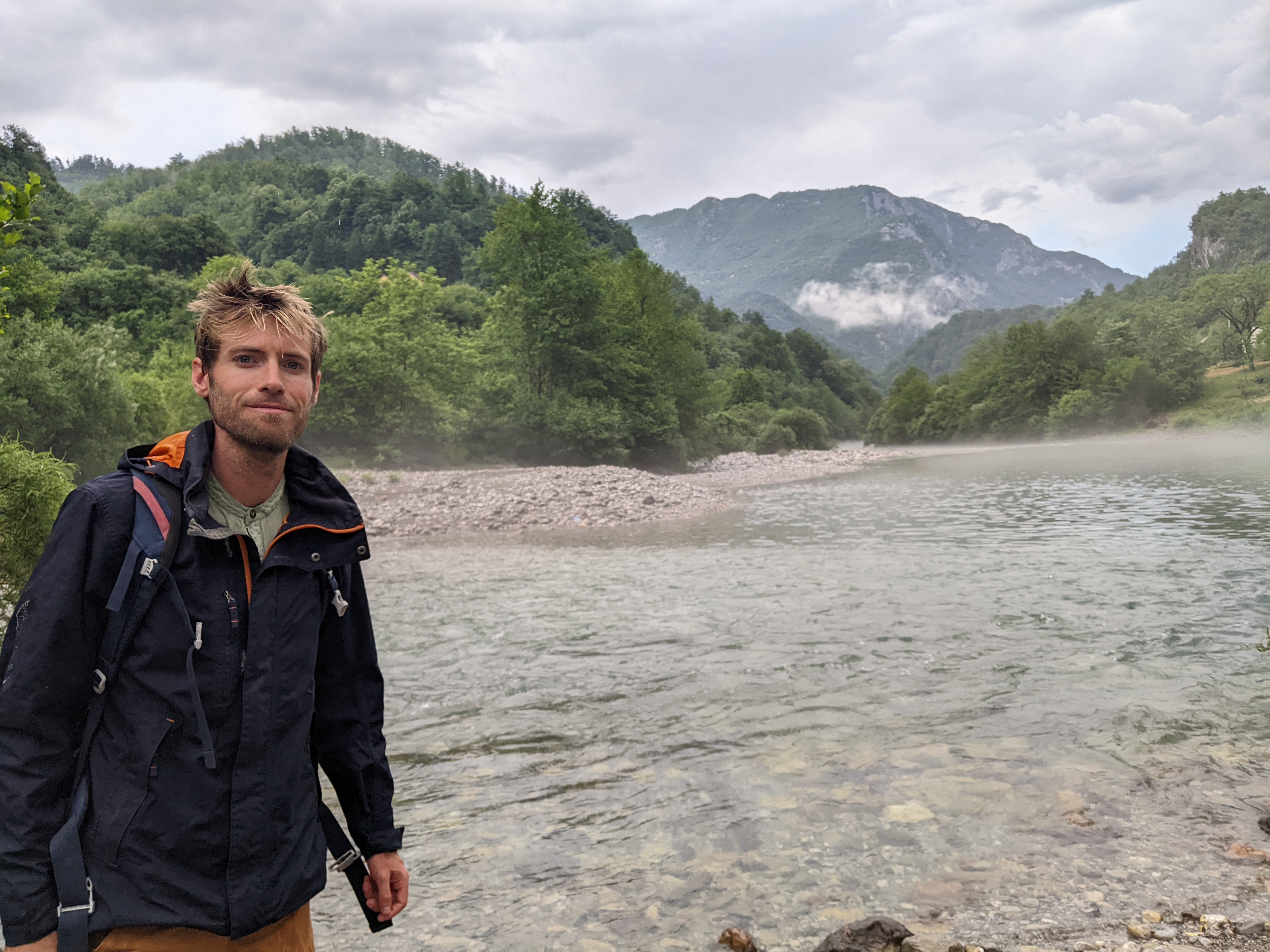 Kikou ! Nous voici à Črna Gora, le Montenegro. Fait pas beau et le sourire est un peu pincé. On se dirige vers le parc de Biogradska Gora.Aaaaah ! On y est ! Toujours un peu nuageux mais il y a des éclaircies. Derrière Lisa c’est Biogradska Gora : un des premiers parcs naturels d’Europe et une des dernières forêts primaires. C’est beau !