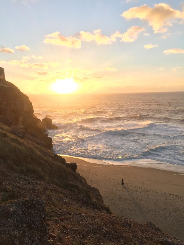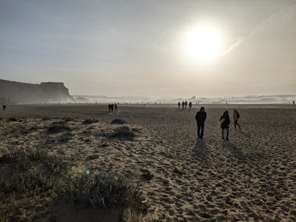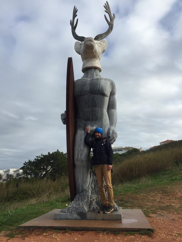 Mais loin très loin au large une énorme tempête a secoué la surface de l’eau. Une houle de 5 mètres va venir frapper la côte. Inarrêtable.Un frisson nous parcourt l’échine. Un démon de l’ancien monde, terré dans l’ombre, se réveille.La houle au large est fragmentée, divisée, accélérée par un canyon sous-marin 3 fois plus profond que le Grand Canyon. Ce canyon arrive juste au bord de la pointe de la Praia do Norte c’est là que la vague se forme grâce à l’addition de plusieurs houles. Bon on va pas se mentir, sur la vidéo on voit pas que la vague fait 15 mètres de haut 😅.Et voilà la vague !Regardez celle-ci sur grand écran parce qu’on y voit un tout petit point descendre la montagne qui s’écroule derrière lui.Sur la plage en bas la baignade est clairement déconseillée. Il n’y a plus une parcelle de bleu dans cette eau blanche d’écume.En haut sur la pointe, il y a du vent. L’ouverture d’un parapluie trop grand est clairement déconseillée.Le vent est tellement puissant qu’on s’accroche à tout ce qu’on peut pour ne pas s’envoler. Apprécions au passage cette œuvre d’art qui fait le lien entre le passé de Nazaré, une terre peuplée de cerfs, et son présent, une poignée de surfers hypers entraînés et sponsorisés par RedBull tentant de dompter la vague. Une dernière vidéo de la vague.