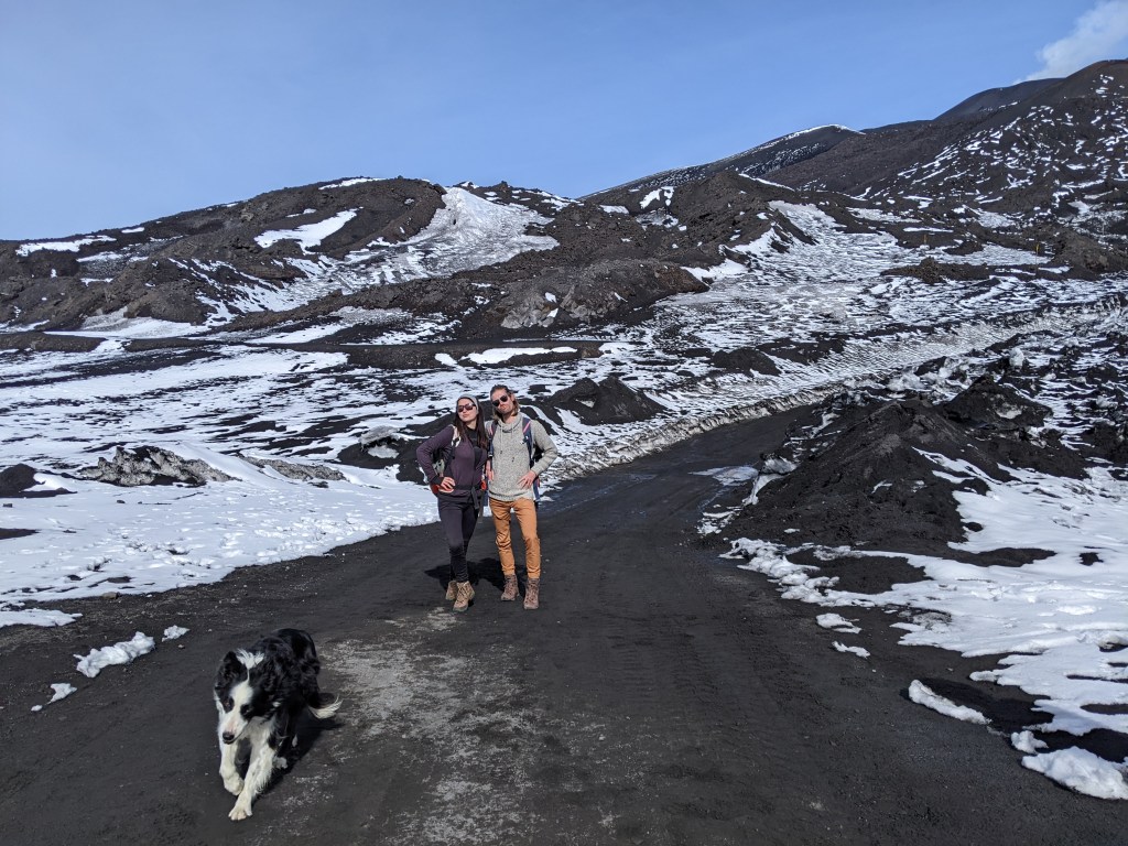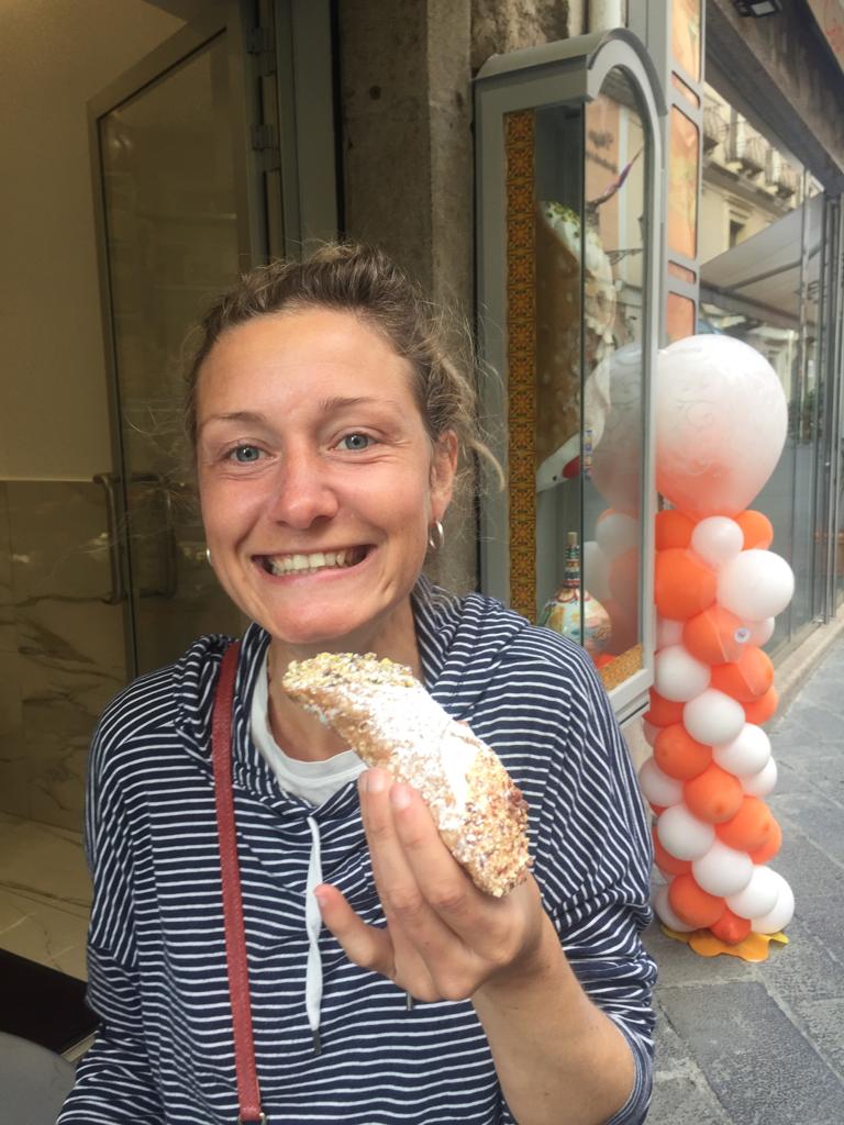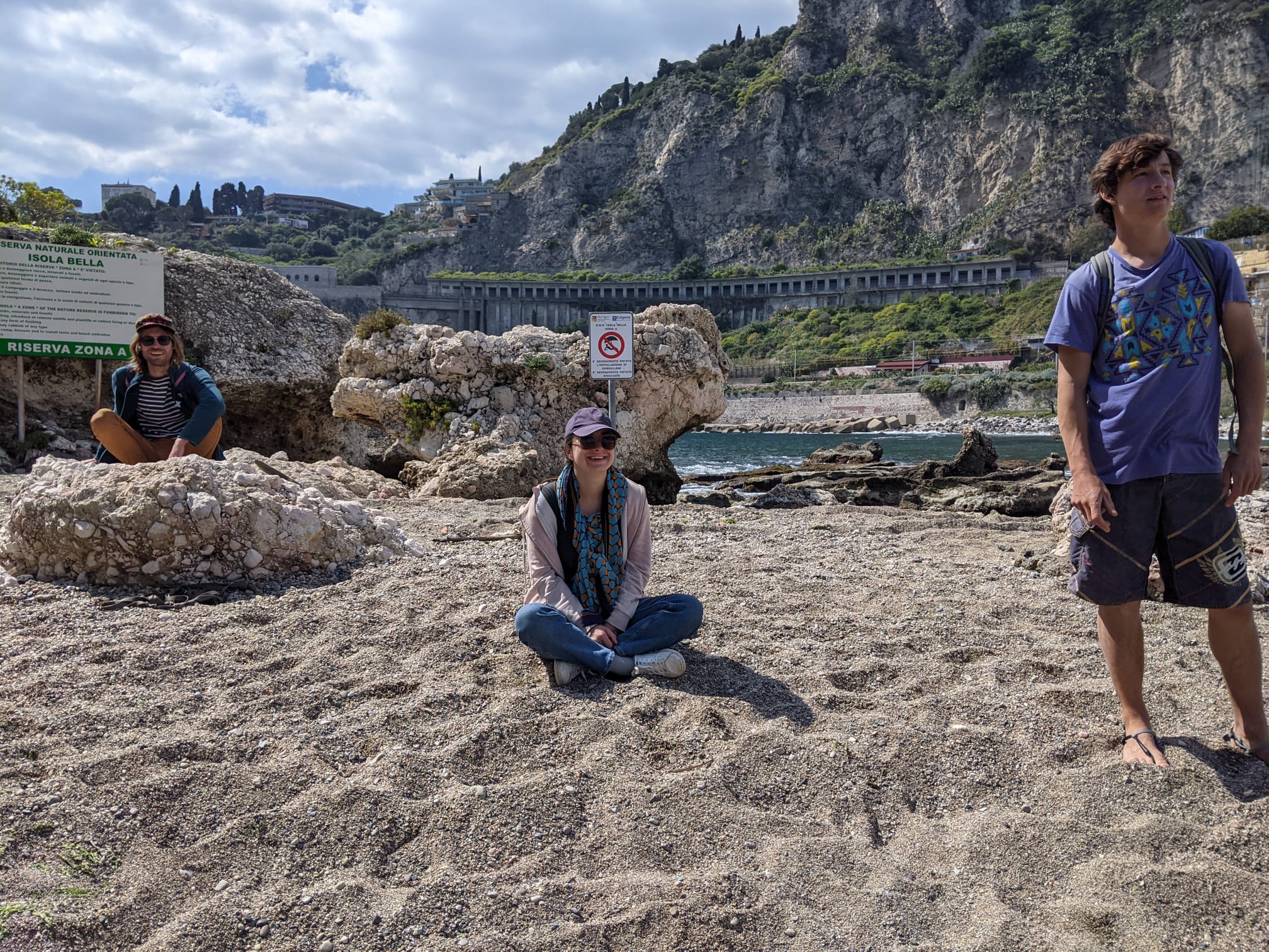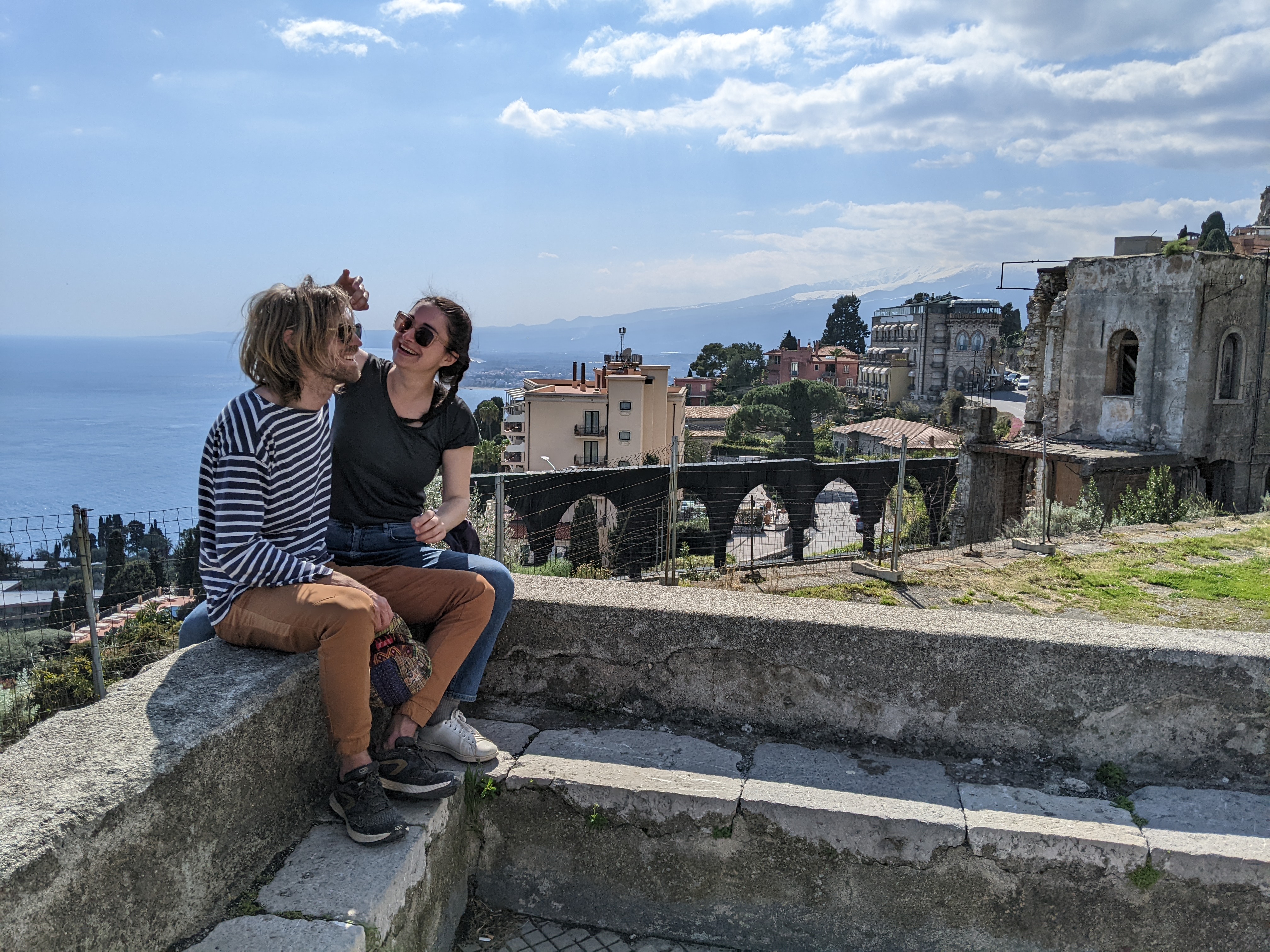 Syracuse et sa belle île d’OrtygiaAaaaargh on se fait attaquer par les esprits des morts dans les tombes troglodytes de la nécropole de PantalicaPerdus au milieu des montagnes ce ne sont pas des esprits que nous avons rencontrés mais des supers copains : Théo et Cassandra. Nous avons formé la communauté de la procuration : objectif Palerme pour une permanence du consul. Donc en attendant le jour de la procuration on s’est baladés. Petit dej au pied de l’Etna !Tuto pose de star : jambe décalée, la fesse en l’air et la main sur la hanche. Appâter un chien mignon pour compléter.Repas et sieste chauffés par le sable noir. Pas possible d’aller plus haut sans guide, trop d’activité actuellement !Descente au dessus de la mer de nuages.On joue chez les voisins sur une plage où on est restés deux jours : apéro, gym, séance coiffure, jeux…Sur la route de Palerme, nuit au bord de l’eau.Ballade sous les palmiers après le petit tour au consulat.Après la tournée de procurations, la tournée de Spritz !Avant de quitter la Sicile on passe une journée entre Isola Bella et Taormina.Isola Bella vue depuis Taormina On se recoiffe pour la photo.La mer est bleue, le ciel est bleu, ils sont amoureux.Selfie de copains malinsLe meilleur canoli de Sicile se trouve à Taormina et Cassandra a hâte de le goûter. Verdict : délicieux !!Du sucre et des garçons : les plaisirs de la vie.Theo est prêt pour une tournée de… Spritz !!Le soleil se couche et nous quittons la Sicile. Les copains suivent sur le bateau suivant pour un retour en Calabre.