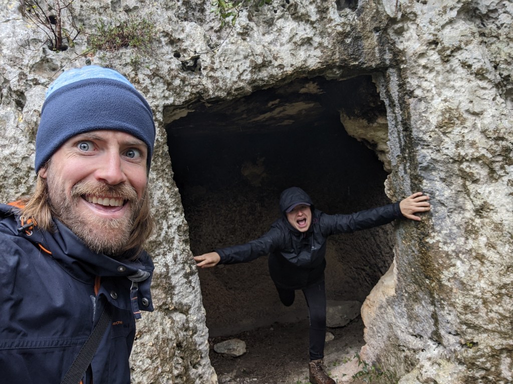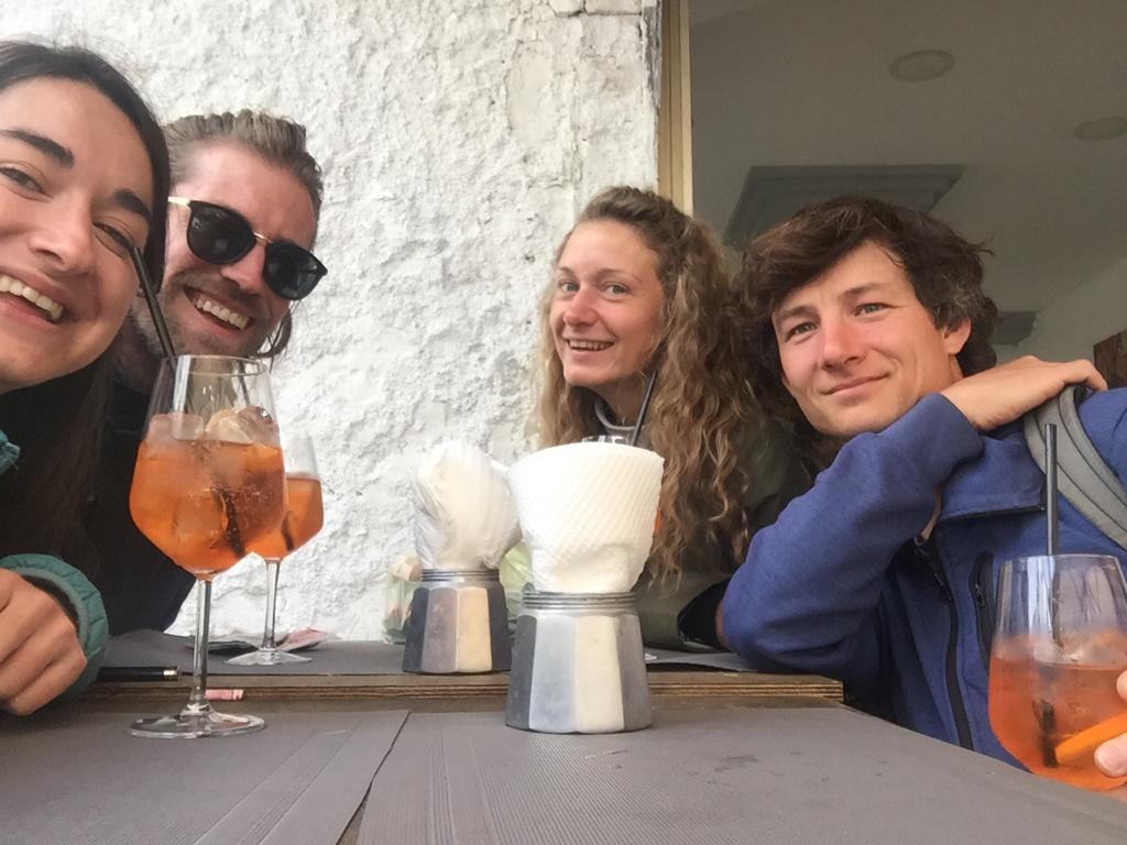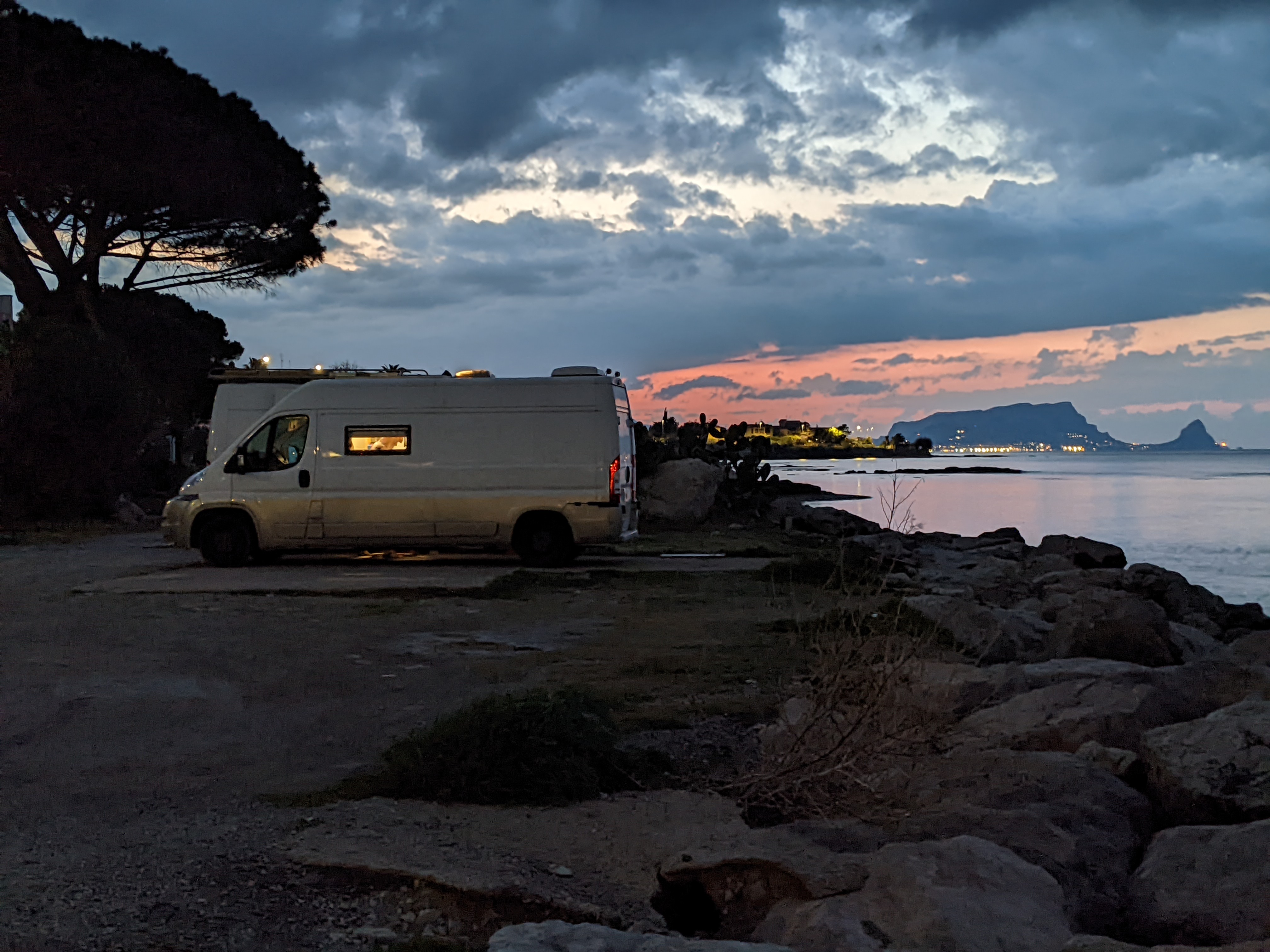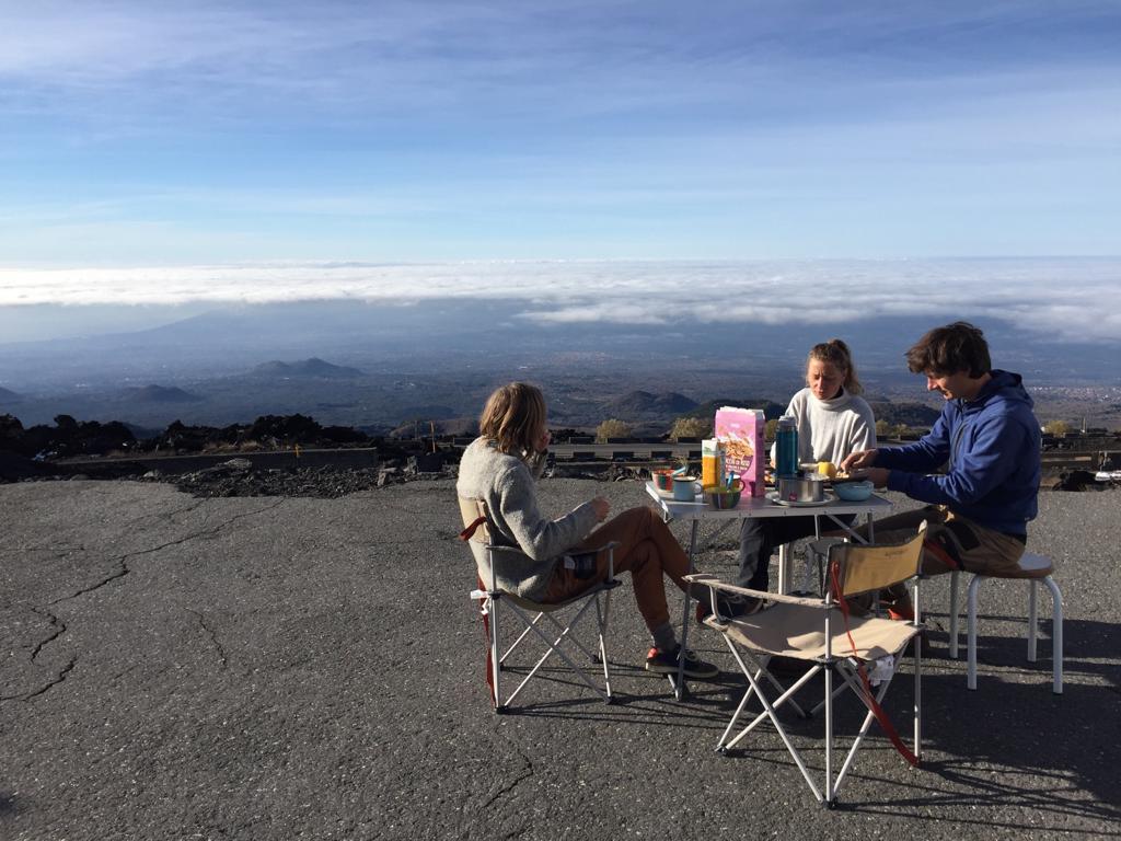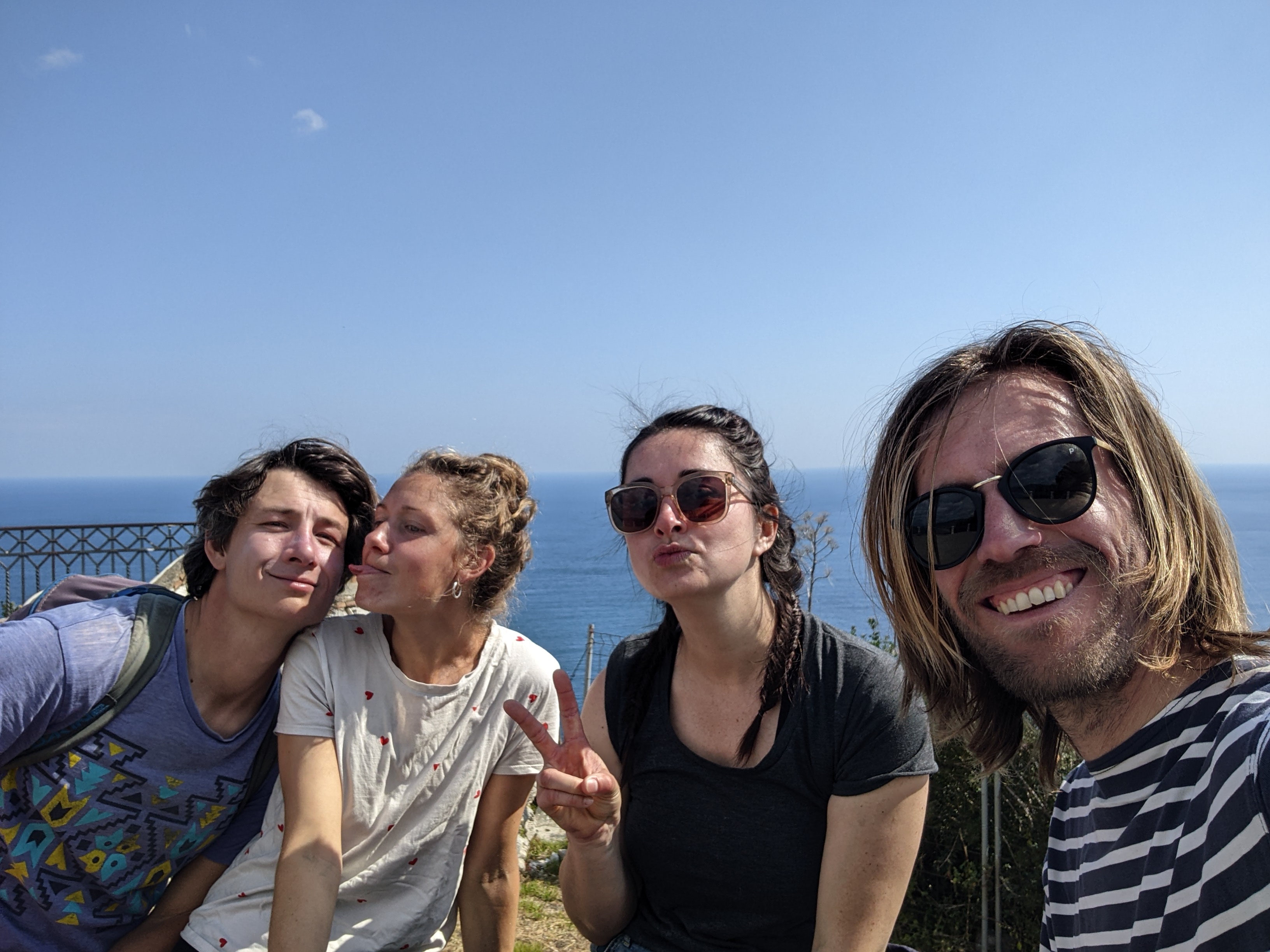 Syracuse et sa belle île d’OrtygiaAaaaargh on se fait attaquer par les esprits des morts dans les tombes troglodytes de la nécropole de PantalicaPerdus au milieu des montagnes ce ne sont pas des esprits que nous avons rencontrés mais des supers copains : Théo et Cassandra. Nous avons formé la communauté de la procuration : objectif Palerme pour une permanence du consul. Donc en attendant le jour de la procuration on s’est baladés. Petit dej au pied de l’Etna !Tuto pose de star : jambe décalée, la fesse en l’air et la main sur la hanche. Appâter un chien mignon pour compléter.Repas et sieste chauffés par le sable noir. Pas possible d’aller plus haut sans guide, trop d’activité actuellement !Descente au dessus de la mer de nuages.On joue chez les voisins sur une plage où on est restés deux jours : apéro, gym, séance coiffure, jeux…Sur la route de Palerme, nuit au bord de l’eau.Ballade sous les palmiers après le petit tour au consulat.Après la tournée de procurations, la tournée de Spritz !Avant de quitter la Sicile on passe une journée entre Isola Bella et Taormina.Isola Bella vue depuis Taormina On se recoiffe pour la photo.La mer est bleue, le ciel est bleu, ils sont amoureux.Selfie de copains malinsLe meilleur canoli de Sicile se trouve à Taormina et Cassandra a hâte de le goûter. Verdict : délicieux !!Du sucre et des garçons : les plaisirs de la vie.Theo est prêt pour une tournée de… Spritz !!Le soleil se couche et nous quittons la Sicile. Les copains suivent sur le bateau suivant pour un retour en Calabre.